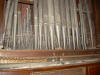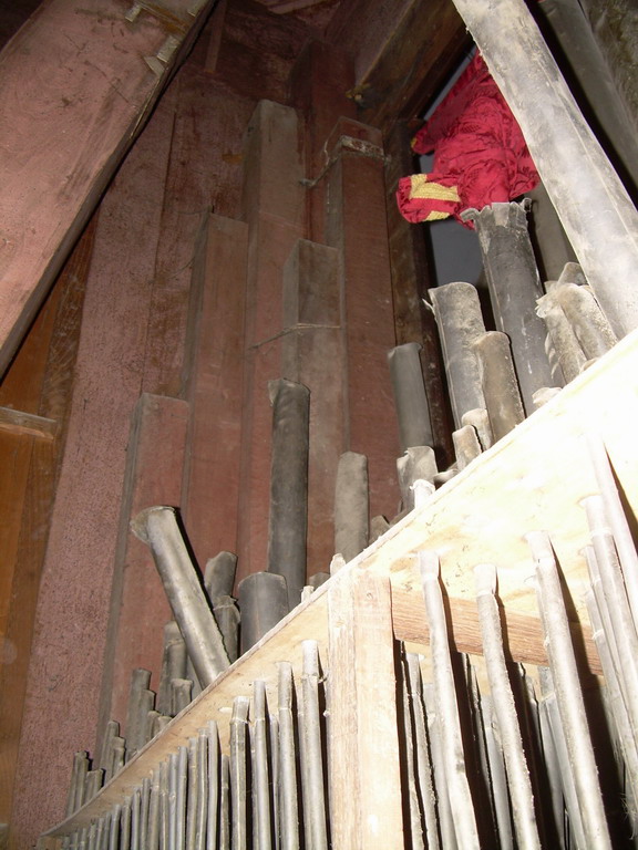 più gravi, la tuba è gomitata). Ai lati del somiere maestro, 13 canne lignee
